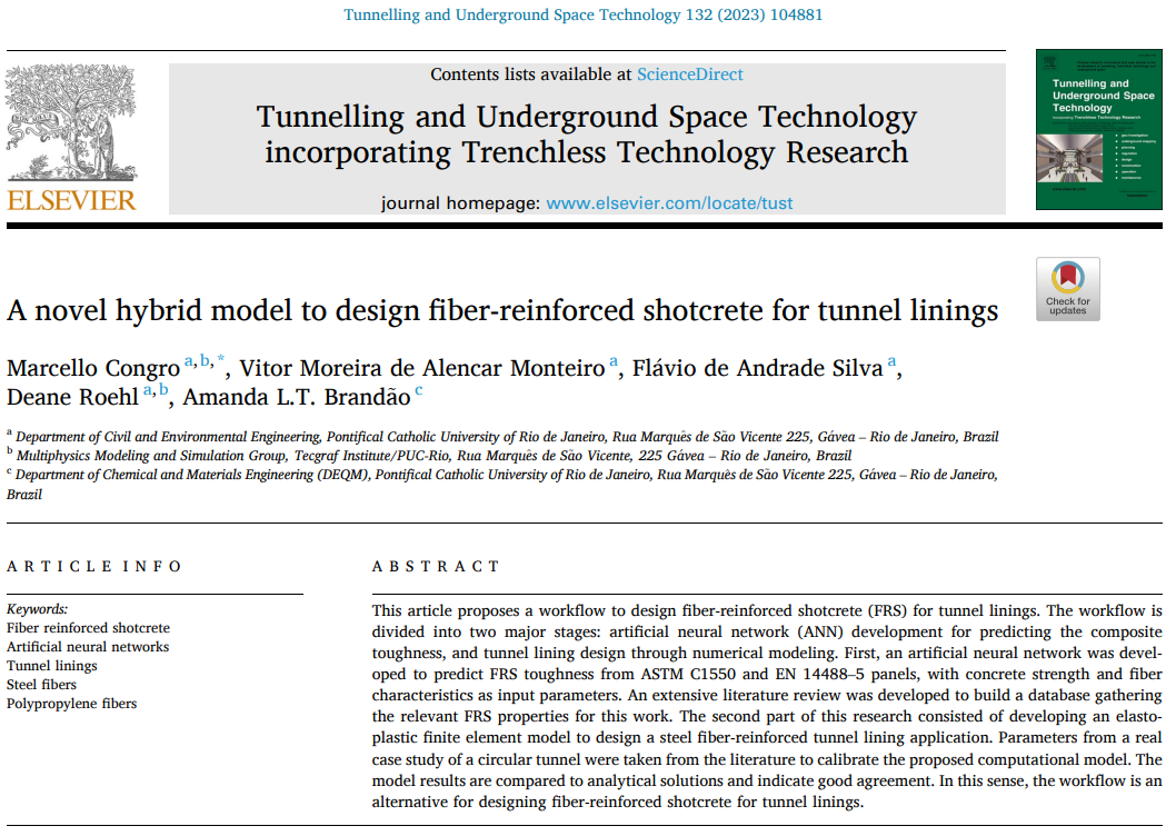 » CONGRO, M.; MOREIRA DE ALENCAR MONTEIRO, V.; DE ANDRADE SILVA, F.; ROEHL, D.; BRANDÃO, A. L. T. A novel hybrid model to design fiber-reinforced shotcrete for tunnel linings. Tunnelling and Underground Space Technology, v. 132, p. 104881, 2023.