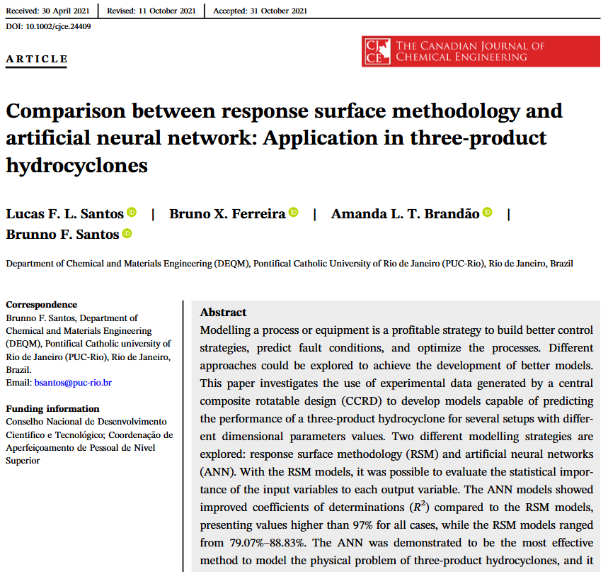 Santos, L. F., Ferreira, B. X., Brandao, A. L., & Santos, B. F. (2023). Comparison between response surface methodology and artificial neural network: Application in three‐product hydrocyclones. The Canadian Journal of Chemical Engineering, 101(1), 380-399.