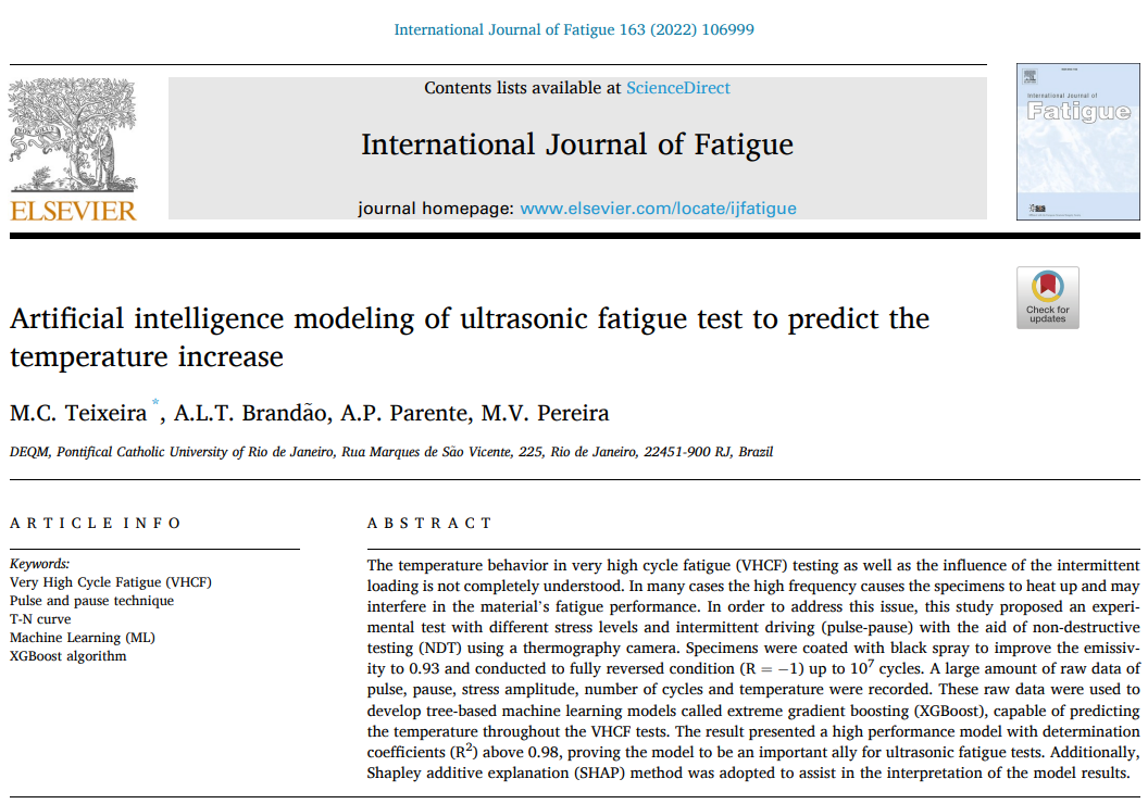 Teixeira, M. C., Brandão, A. L. T., Parente, A. P., & Pereira, M. V. (2022). Artificial intelligence modeling of ultrasonic fatigue test to predict the temperature increase. International Journal of Fatigue, 163, 106999.