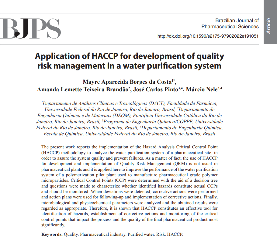Costa, M. A. B. D., Brandão, A. L. T., Pinto, J. C., & Nele, M. (2022). Application of HACCP for development of quality risk management in a water purification system. Brazilian Journal of Pharmaceutical Sciences, 58, e191051.