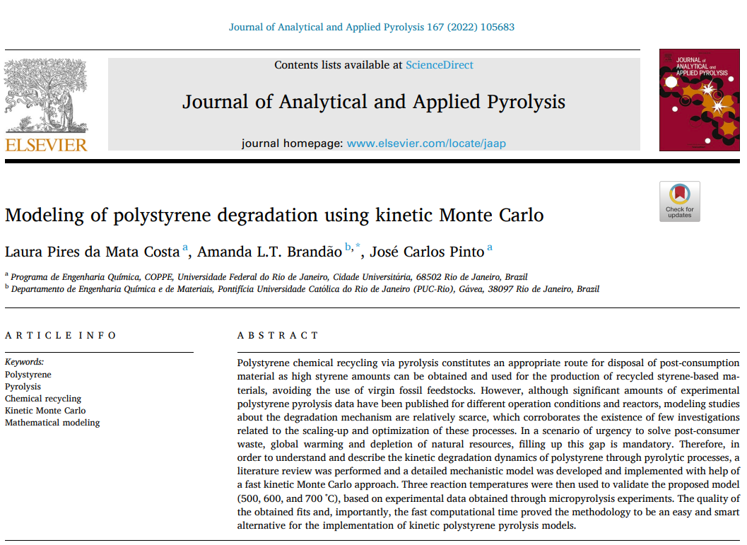 da Mata Costa, L. P., Brandão, A. L., & Pinto, J. C. (2022). Modeling of polystyrene degradation using kinetic Monte Carlo. Journal of Analytical and Applied Pyrolysis, 167, 105683.