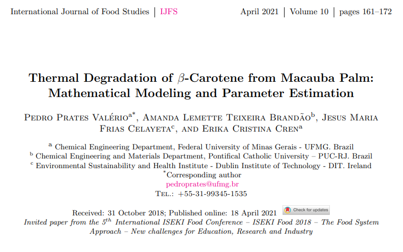 Valério, P. P., Brandão, A. L. T., Celayeta, J. M. F., & Cren, E. C. (2021). Thermal degradation of B-carotene from macauba palm: mathematical modeling and parameter estimation. International Journal of Food Studies, 10(1).