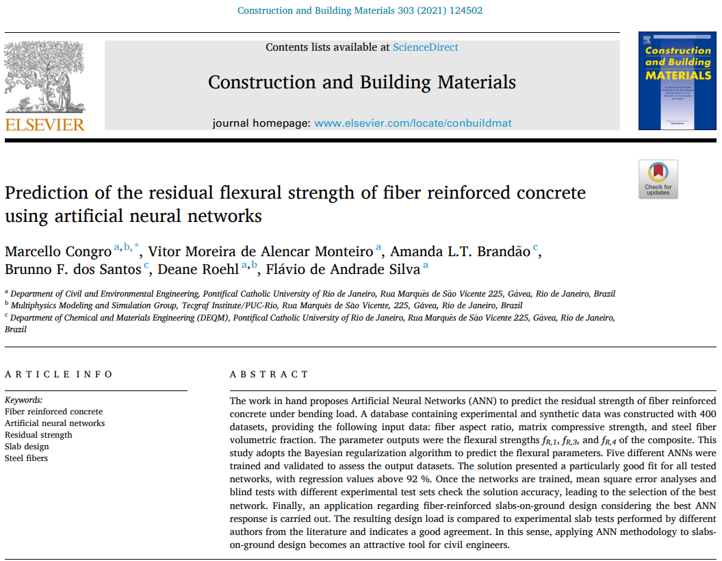 » CONGRO, M.; MONTEIRO, V. M. A.; BRANDÃO, A. L. T.; SANTOS, B. F.; ROEHL, D.; DE ANDRADE SILVA, F. Prediction of the residual flexural strength of fiber reinforced concrete using artificial neural networks. Construction and Building Materials, v. 303, p. 124502, 2021.