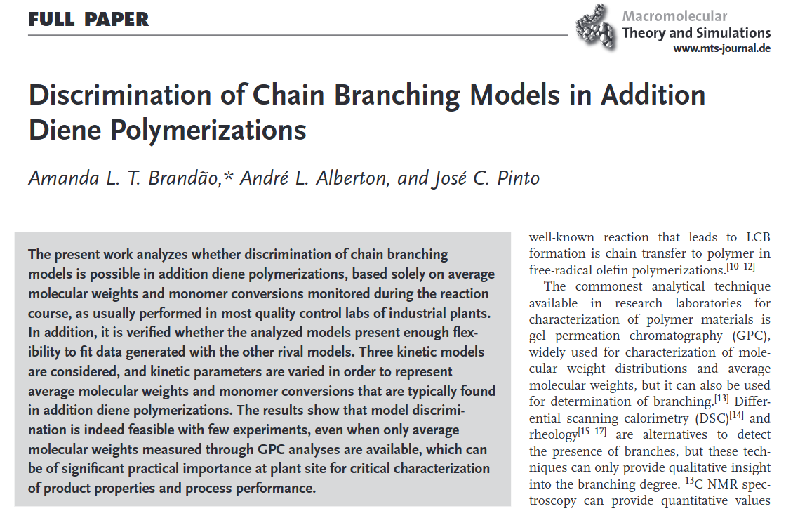 LT Brandão, A., L. Alberton, A., & C. Pinto, J. (2020). Discrimination of chain branching models in addition diene polymerizations. Macromolecular Theory and Simulations, 29(2), 1900043.