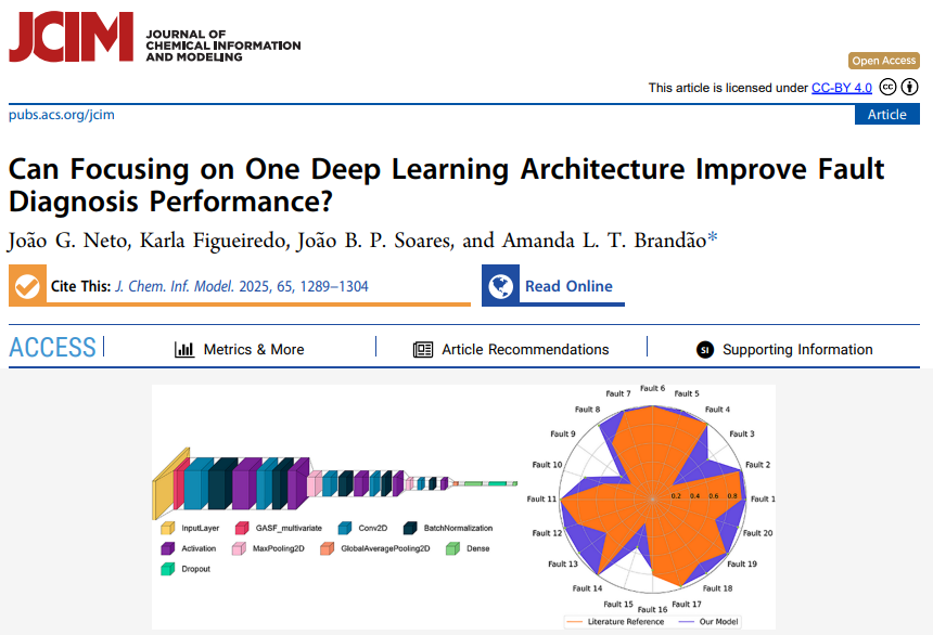 » NETO, J. G.; FIGUEIREDO, K.; SOARES, J. B. P.; BRANDÃO, A. L. T. Can Focusing on One Deep Learning Architecture Improve Fault Diagnosis Performance? Journal of Chemical Information and Modeling, v. 65, p. 1289-1304, 2025.