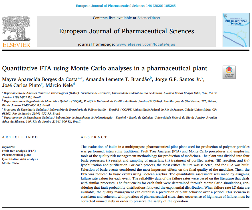 da Costa, M. A. B., Brandão, A. L. T., Santos Jr, J. G., Pinto, J. C., & Nele, M. (2020). Quantitative FTA using Monte Carlo analyses in a pharmaceutical plant. European Journal of Pharmaceutical Sciences, 146, 105265.