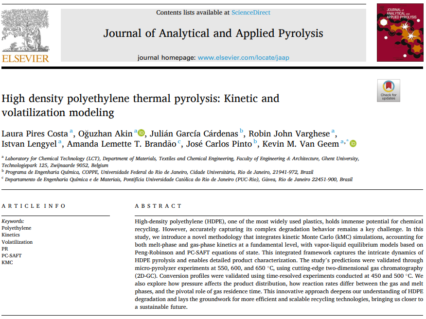 Costa, L. P., Akin, O., Cárdenas, J. G., Varghese, R. J., Lengyel, I., Brandão, A. L. T., … & Van Geem, K. M. (2025). High density polyethylene thermal pyrolysis: Kinetic and volatilization modeling. Journal of Analytical and Applied Pyrolysis, 191, 107168.