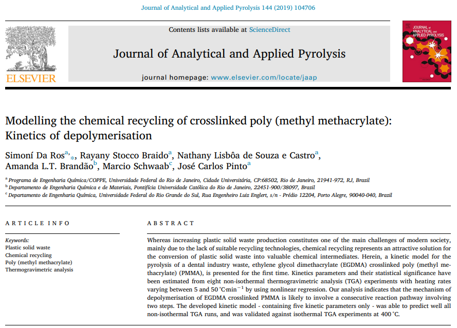 Da Ros, S., Braido, R. S., e Castro, N. L. D. S., Brandão, A. L., Schwaab, M., & Pinto, J. C. (2019). Modelling the chemical recycling of crosslinked poly (methyl methacrylate): Kinetics of depolymerisation. Journal of Analytical and Applied Pyrolysis, 144, 104706.