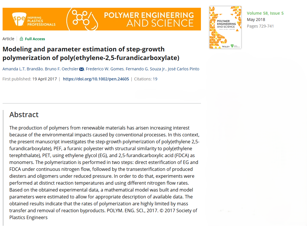 LT Brandão, A., F. Oechsler, B., W. Gomes, F., G. Souza Jr, F., & Carlos Pinto, J. (2018). Modeling and parameter estimation of step‐growth polymerization of poly (ethylene‐2, 5‐furandicarboxylate). Polymer Engineering & Science, 58(5), 729-741.