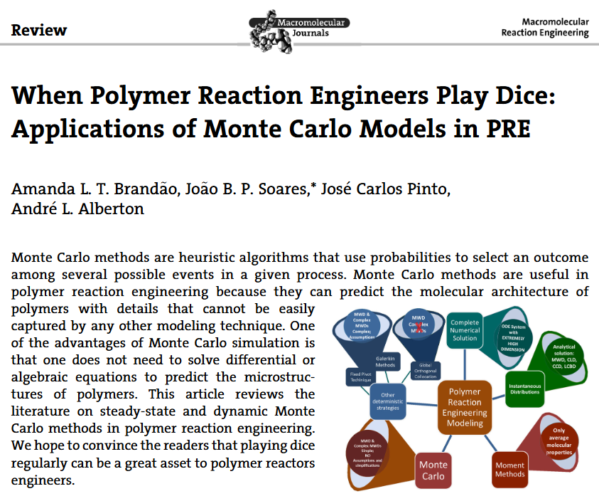 Brandao, A. L., Soares, J. B., Pinto, J. C., & Alberton, A. L. (2015). When polymer reaction engineers play dice: applications of Monte Carlo models in PRE. Macromolecular Reaction Engineering, 9(3), 141-185.