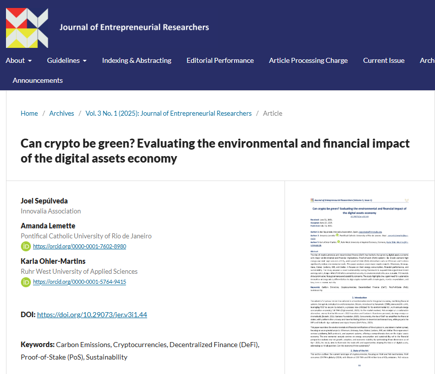 Sepúlveda, J., Lemette, A., & Ohler-Martins, K. (2025). Can crypto be green? Evaluating the environmental and financial impact of the digital assets economy. Journal of Entrepreneurial Researchers.