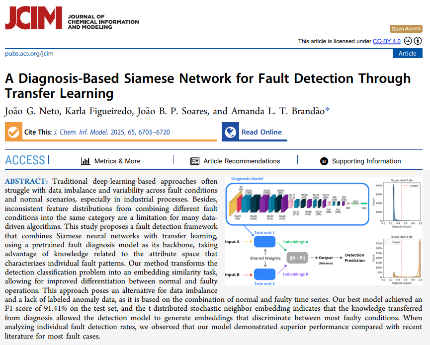 » NETO, J. G.; FIGUEIREDO, K.; SOARES, J. B. P.; BRANDÃO, A. L. T. A Diagnosis-Based Siamese Network for Fault Detection Through Transfer Learning. Journal of Chemical Information and Modeling, v. 65, p. 6703-6720, 2025.