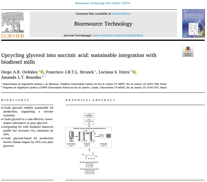 Ordóñez, D. A., Strunck, F. J., Dutra, L. S., & Brandão, A. L. (2025). Upcycling glycerol into succinic acid: sustainable integration with biodiesel mills. Bioresource Technology, 433, 132716.