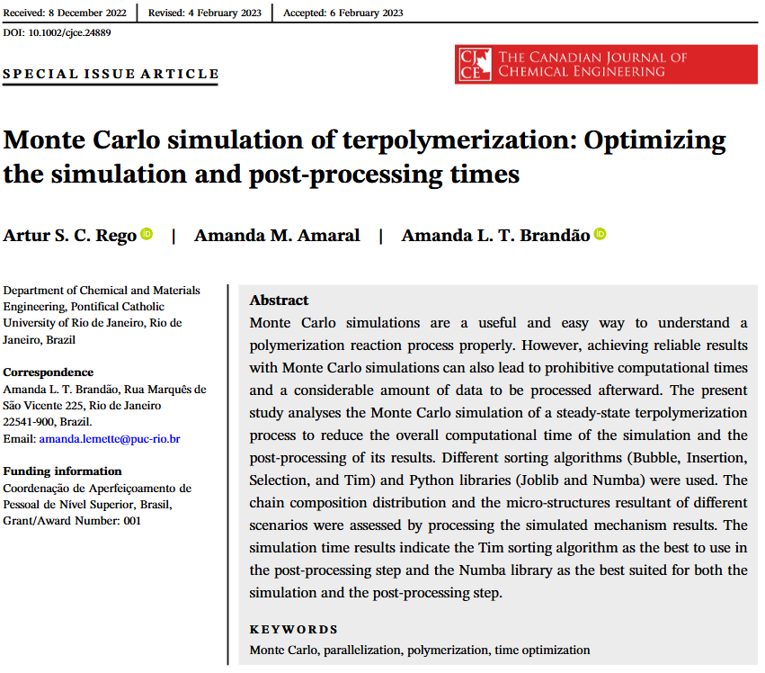 Rego, A. S., Amaral, A. M., & Brandao, A. L. (2023). Monte Carlo simulation of terpolymerization: Optimizing the simulation and post‐processing times. The Canadian Journal of Chemical Engineering, 101(9), 5059-5071.