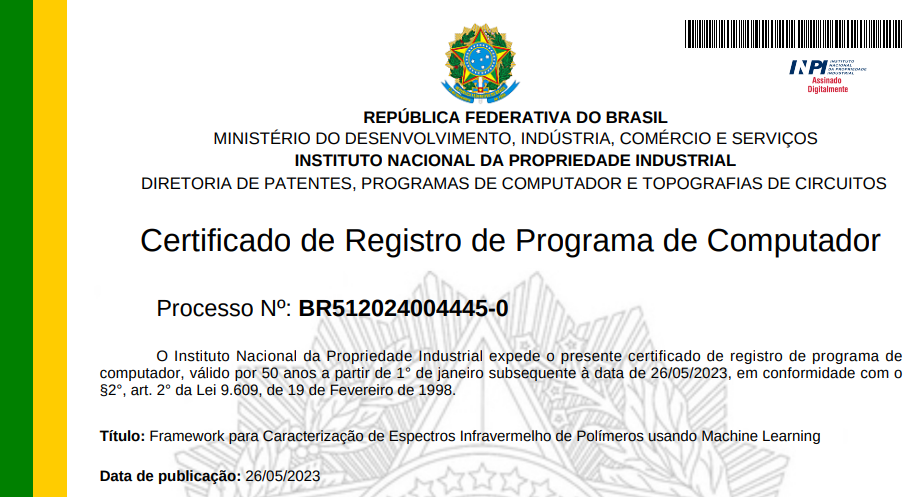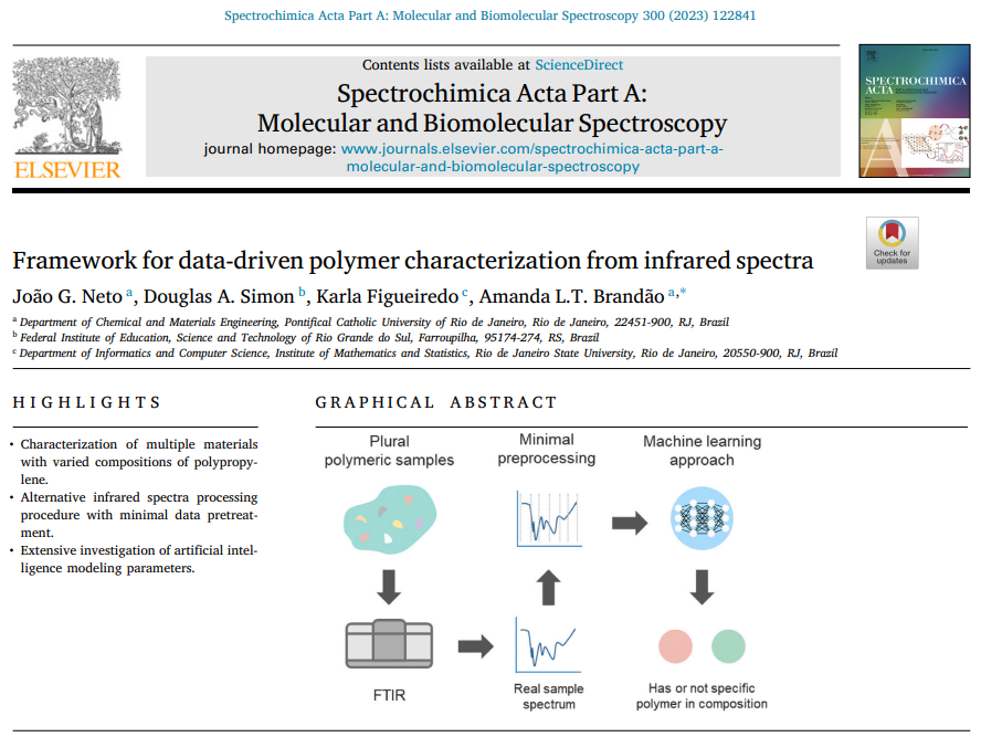 » NETO, J. G.; SIMON, D. A.; FIGUEIREDO, K. T.; BRANDÃO, A. L. T. Framework for data-driven polymer characterization from infrared spectra. Spectrochimica Acta Part A, v. 300, p. 122841, 2023.