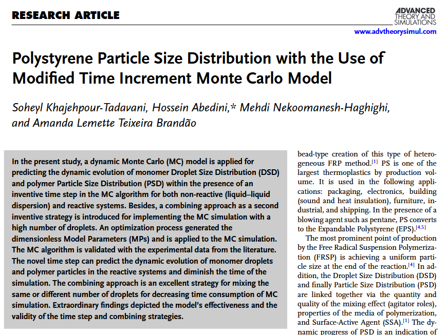 Khajehpour‐Tadavani, S., Abedini, H., Nekoomanesh‐Haghighi, M., & Brandão, A. L. T. (2024). Polystyrene Particle Size Distribution with the Use of Modified Time Increment Monte Carlo Model. Advanced Theory and Simulations, 7(10), 2400359.